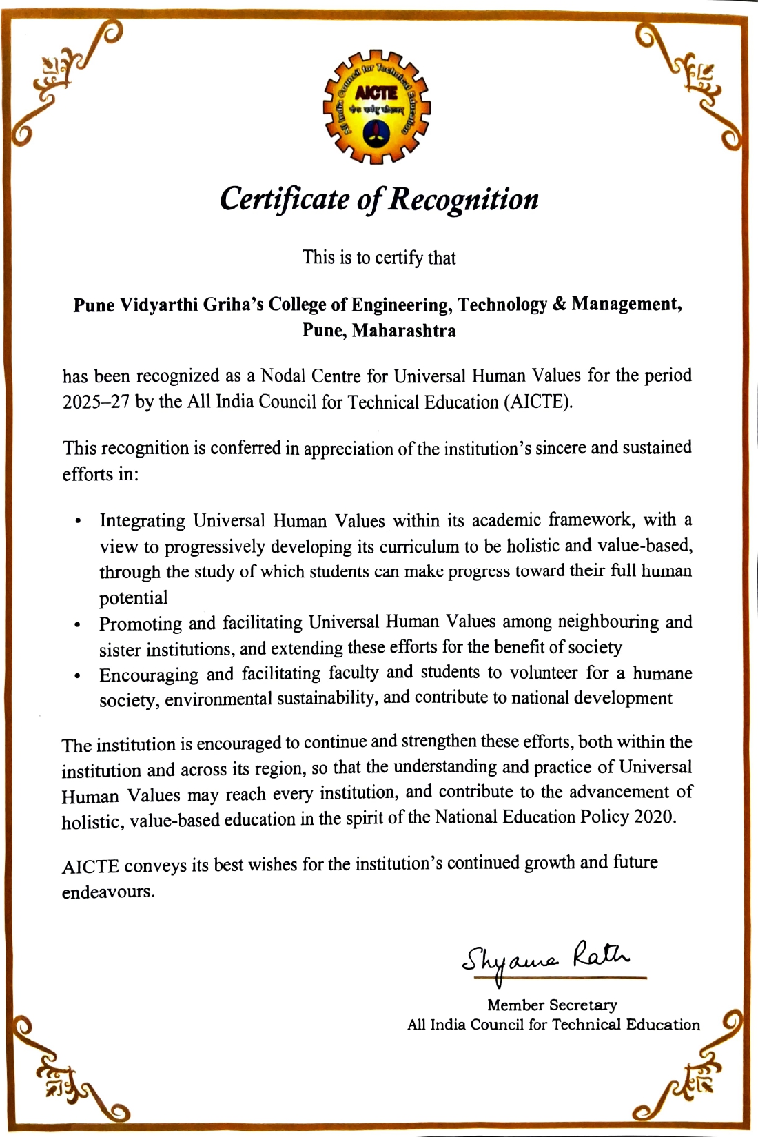 | 1 | Dr.Shrilekha Ghatte | UHV-Intro FDP[Self-funded] | Pimpri Chinchwad College Of Engineering Akurdi. | 15- 17th March 2024 | Observer |